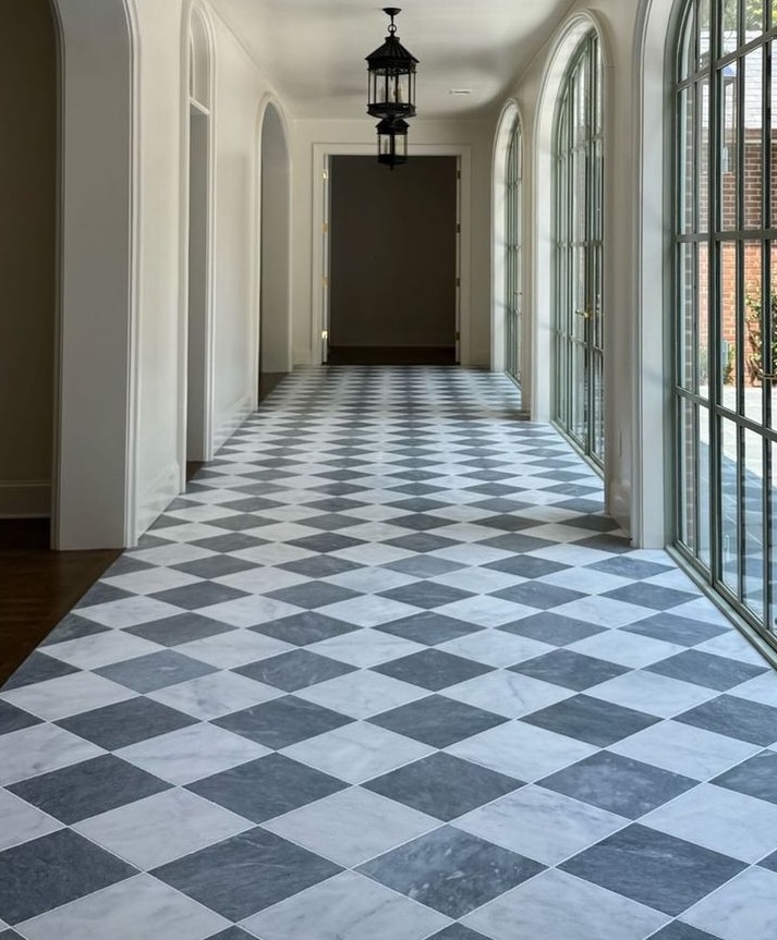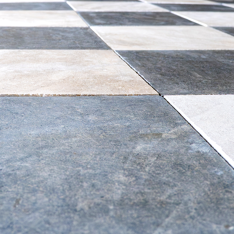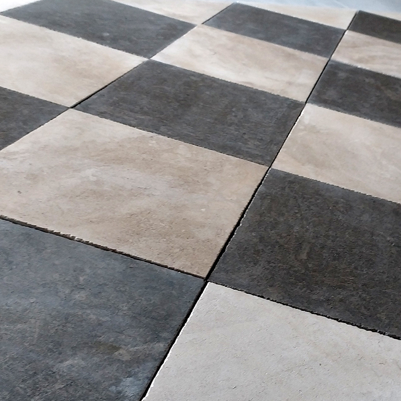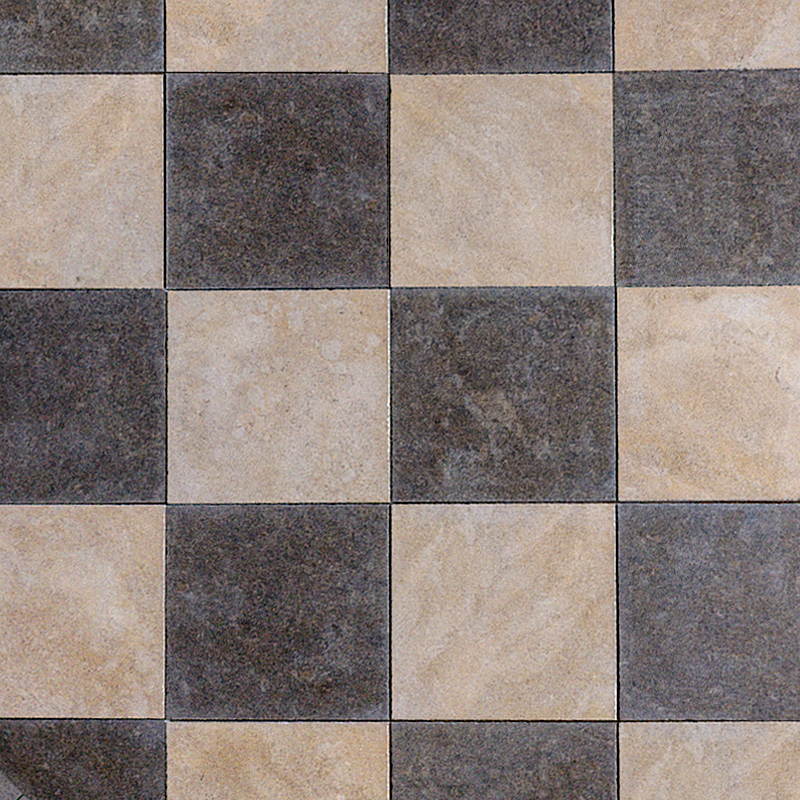 Dallage à damier, idéal pour embellir aussi bien les petites que les grandes pièces. Ce revêtement associe des dalles claire beige et gris foncé, offrant un contraste élégant et intemporel.