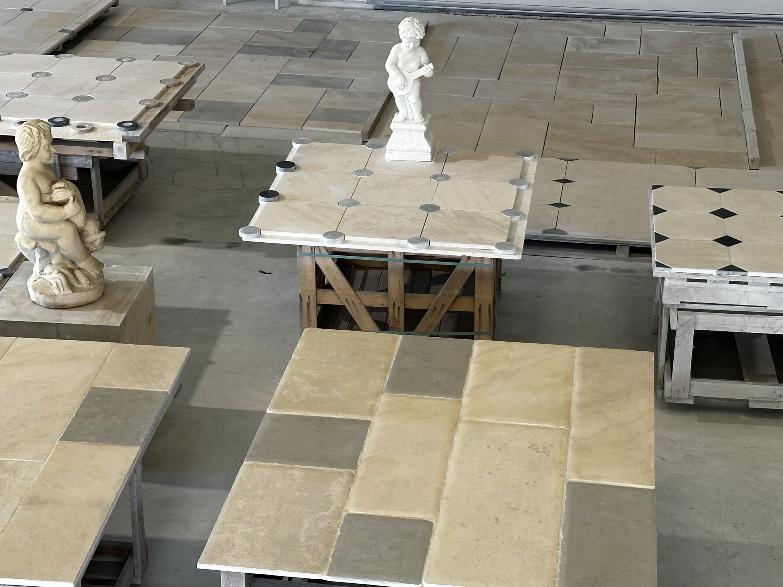 Nous produisons plusieurs types de dallages à cabochons carrés ou ronds avec des navettes, des Opus romain ainsi que des grands modèles de 100×100 cm / 140×70 cm.