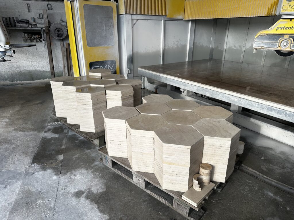 Le dallage hexagonal grand modèle, aux dimensions de 40 × 40 cm de pointe à pointe et 34 × 34 cm de plat à plat, offre une solution de revêtement harmonieuse et de très bon goût. Finition bords droits ou vieillis.
