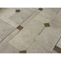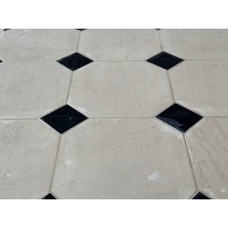Dallage octogone avec cabochon rond ou carré et finition des arêtes droites ou vieillies.